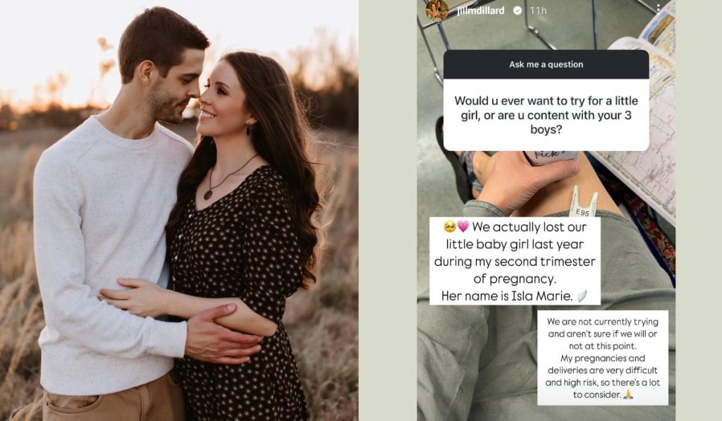 They asked if Jill and her husband, Derick, were comfortable with having only sons in the family. The fan wondered if they would ever try for a daughter. Well, it turns out the Duggar celeb recounted the time she had to lose her daughter Isla Marie Dillard to stillbirth. But that’s not all. She said she and her husband, Derick, were not trying for kids at the moment. She then revealed a massive yet concerning update.